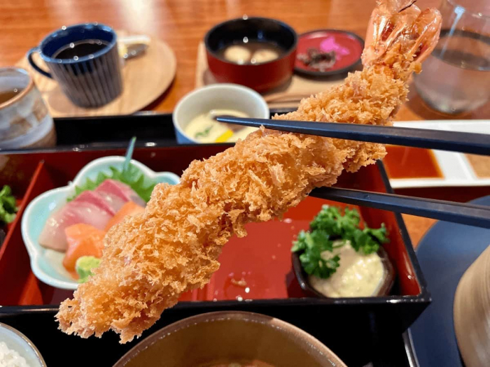 特筆すべきはエビフライの大きさ。お箸で持ち上げるとずっしり重たいんです。ガブッとかじると口いっぱいのエビ!幸せな気持ちになります。