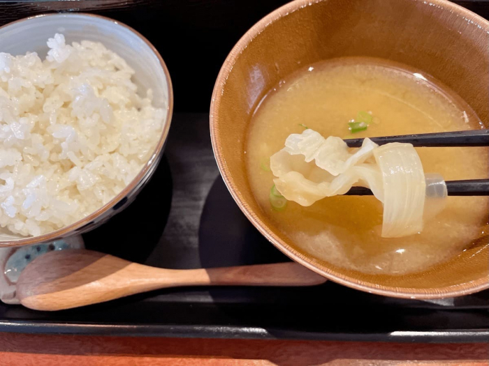いろんな味の合間に飲むお味噌汁が、また沁みる味でほっこりします。少し甘めの麦味噌は、山口県の「とくぢ味噌」のもの。