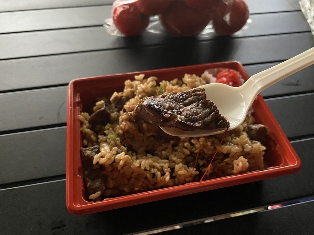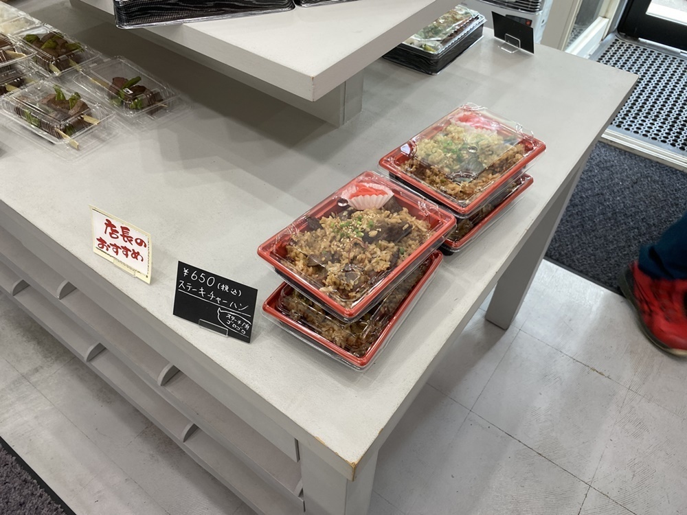 店内には、ステーキ弁当や牛タン三昧弁当、国産牛焼肉弁当、豚味噌焼き弁当など、肉系のお弁当が並んでいましたが、筆者が購入したのは店長のおすすめと書かれた「ステーキチャーハン」です。