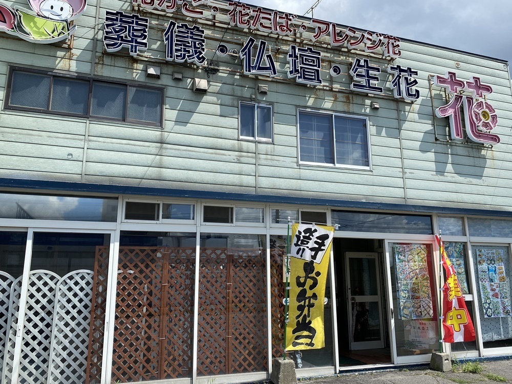 閉店した「旭川はなや」の跡に、2022年8月にオープン。今も建物の壁には、葬儀や仏壇といった文字が残っています。