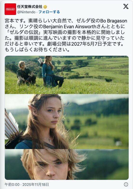 「宮本です。素晴らしい大自然で、ゼルダ役のBo Bragasonさん、リンク役のBenjamin Evan Ainsworthさんとともに「ゼルダの伝説」実写映画の撮影を本格的に開始しました。撮影は順調に進んでいますので静かに見守っていただけると幸いです。劇場公開は2027年5月7日予定です。もうしばらくお待ちください。」