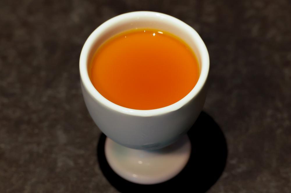荻野氏が師匠から受け継いだという思い出のデザート。煮出したほうじ茶特有のほろ苦さが大人の味わいを演出します。