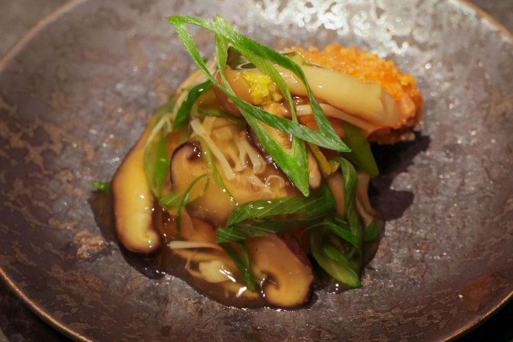 京都名物の湯葉を使った一品。柔らかい湯葉の上に添えたネギと生姜の和え物がアクセント。かつお出汁の餡に溶け込むことで、より深みのある味わいが楽しめます。