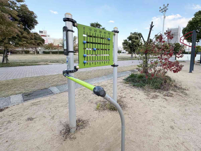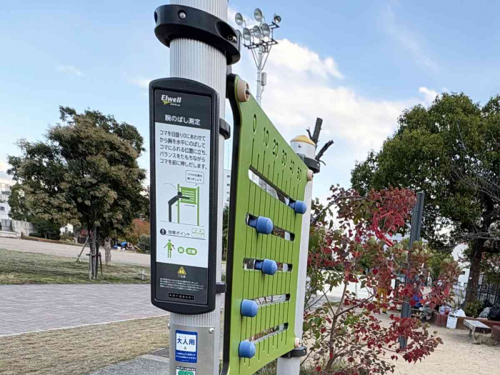 こちらは「腕伸ばし測定」の器具とのことで、腕や足腰のストレッチ、さらにはバランス運動にも効果があるそうです。ほかにもスポーツジムのような健康器具がいくつか並んでおり、気軽に体を動かすことができます。試してみると意外とスッキリしますよ。