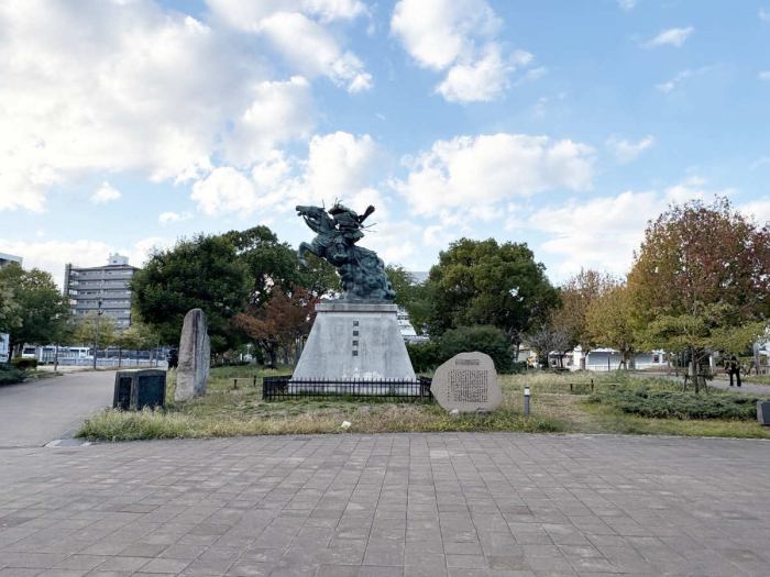 新開地商店街のアーケードを抜けると、一気に開放的な空間が広がります。視線の先には、同公園のシンボルである馬にまたがった楠公さん(楠木正成)の勇ましい像が堂々と立ち、訪れる人を迎えてくれます。
