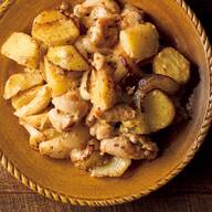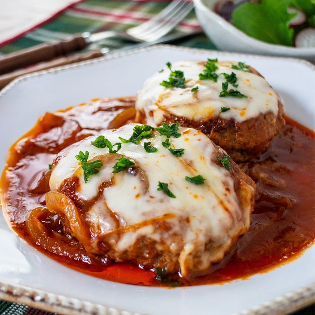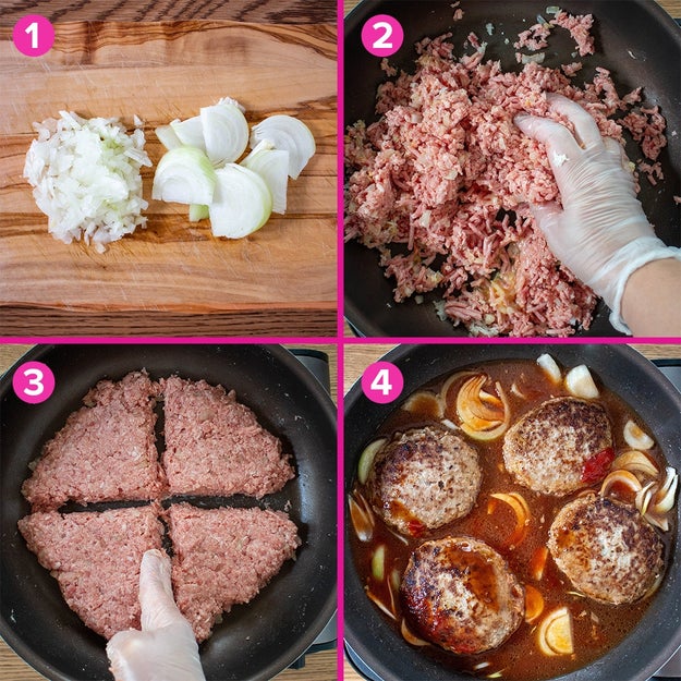 ④ ③にくし切りにした玉ねぎと【B】を加え、ふたをして中火で約10分煮込み、ハンバーグの中心までしっかり火を通す。仕上げにピザ用チーズをのせ、再びふたをして1分ほど加熱したら、完成!