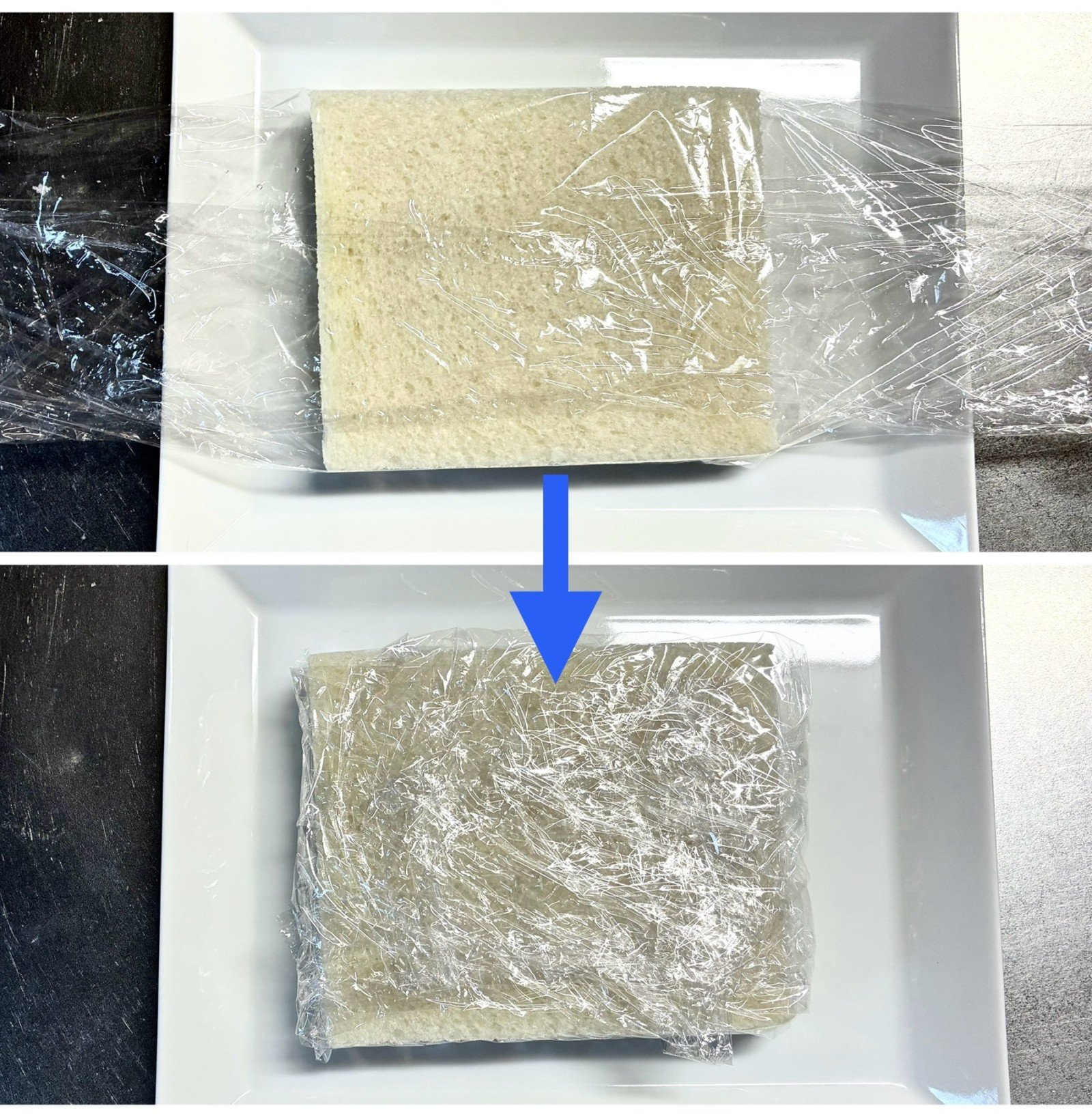 7.上下のラップも剥がし、線がついたところを包丁でカットします。