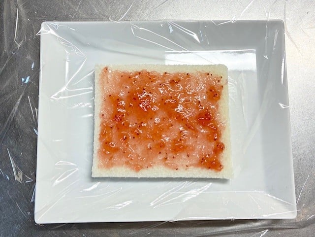 2.パンにジャムを薄く塗り、周囲に5mmほど塗らない余白を残します。