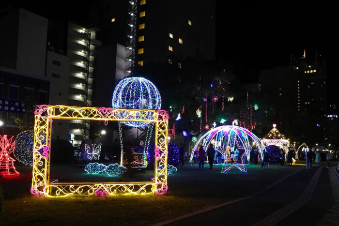 2025年11月17日(月)の点灯式で今年のライトアップがスタートしたドリミネーション。平和大通りを歩くと、約100万球による電球がエリアごとに分かれてコンセプトの異なる光のオブジェが設置されており、まるで絵本や童話の中を散歩しているような錯覚に。