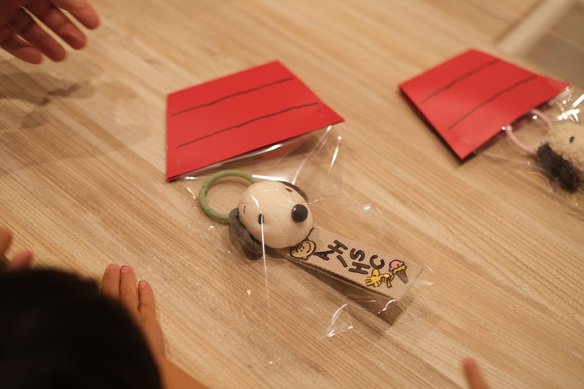 ワッペンを選んだあとは配置を考え、最後にスタッフの方にアイロンで接着してもらって完成。所要15分ほどで難しい工程はないので3歳の次男も楽しく参加することができました。完成したタグは、専用のフォトスポットで撮影ができるほか、スヌーピーの家をイメージしたラッピングをして持って帰ることができます。ワークショップは予約不要で空席状況に応じ参加できるとのことです。