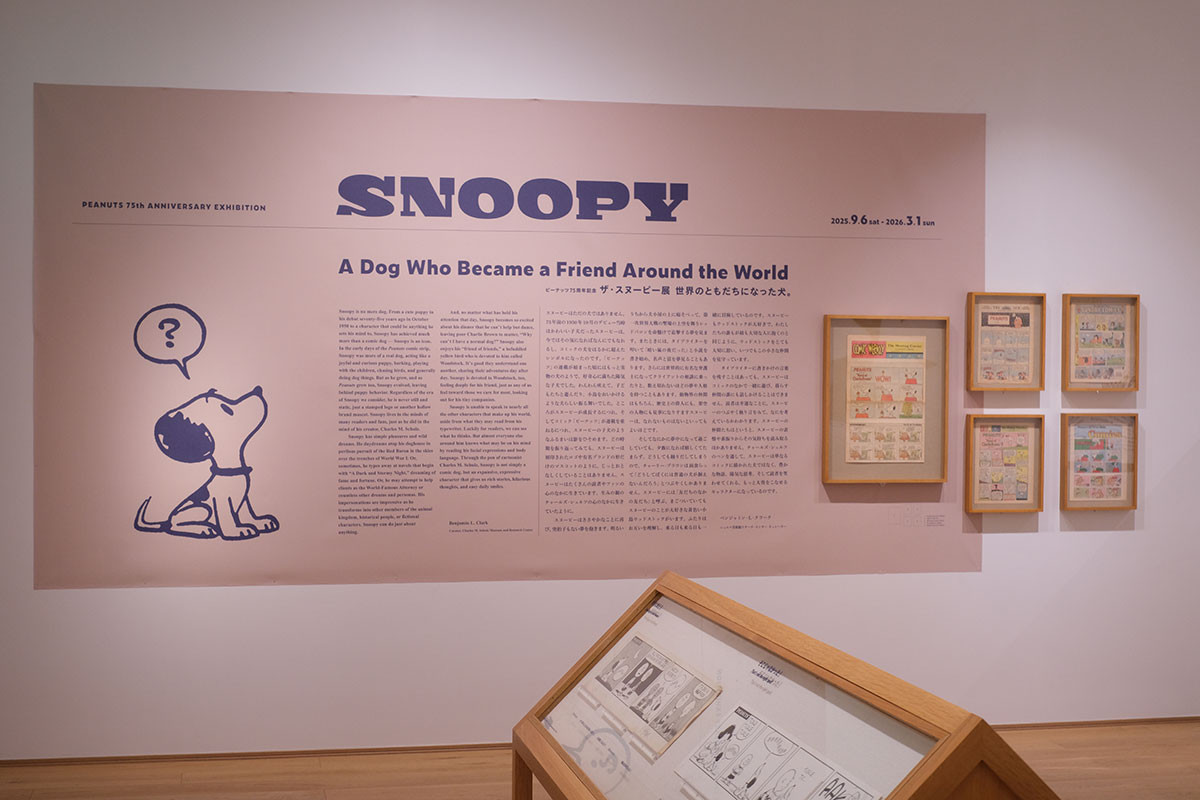 9月6日からは『「ピーナッツ」誕生75周年記念展「ザ・スヌーピー展」世界のともだちになった犬』が開催されています。1950年10月2日に新聞連載が始まった「ピーナッツ」。連載3日目に初登場したスヌーピーはまだ四足歩行のかわいらしい子犬で、現在私たちが目にする笑ったり、怒ったりする人間のような姿のスヌーピーとは少し違った印象です。時代ごとのスヌーピーや仲間たちの変化もわかる興味深い展示です。