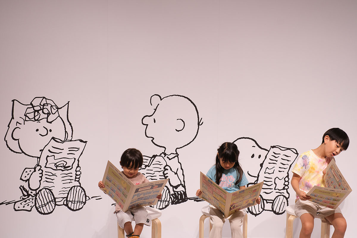 会場の一角には、もともと新聞連載から始まったということで、新聞を手に写真が撮れるフォトスポットが設けられていました。子どもたちも各々の新聞を手に取りパチリ。ぜひ「ピーナッツ」の仲間と一緒に記念撮影してみてください。