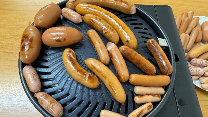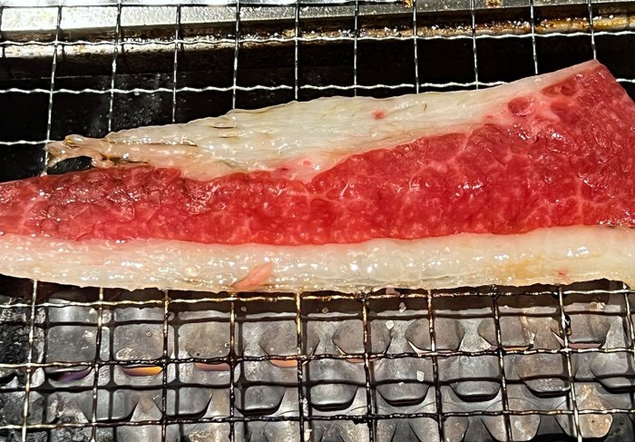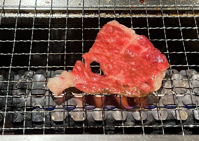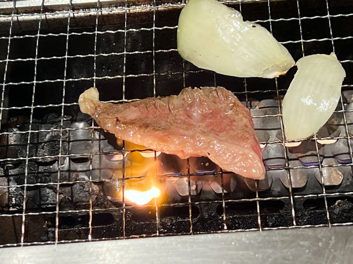 名残を惜しむように、もう1枚、さらにもう1枚と、皿から肉を剥がして網に乗せる。