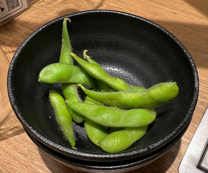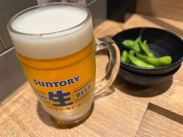 ちょっと枝豆が付く生ビールセット(ジョッキで450円)。贅沢すぎてバチが当たりそうだ。