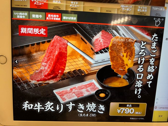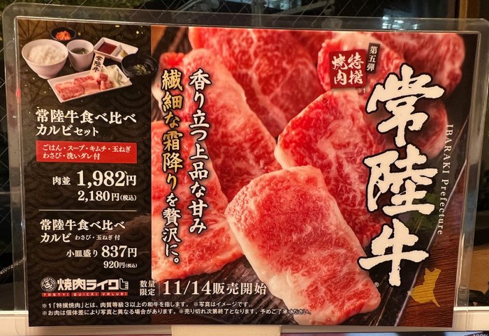 訪れた日は常陸牛が期間限定で販売されていたので、その食べ比べカルビセット並(2180円)をポチッ。
