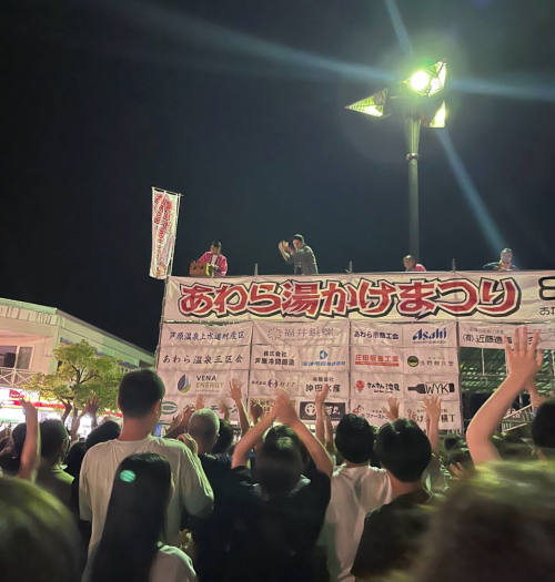 だが、例外もある。年に一度の「湯かけ祭り」は、駅前の広場であわら温泉の湯をぶっかけまくるというワイルドな行事だ。そしてその翌日の夜には、櫓から饅頭を撒くのがお決まりである。節分の豆撒きみたいなものだ。