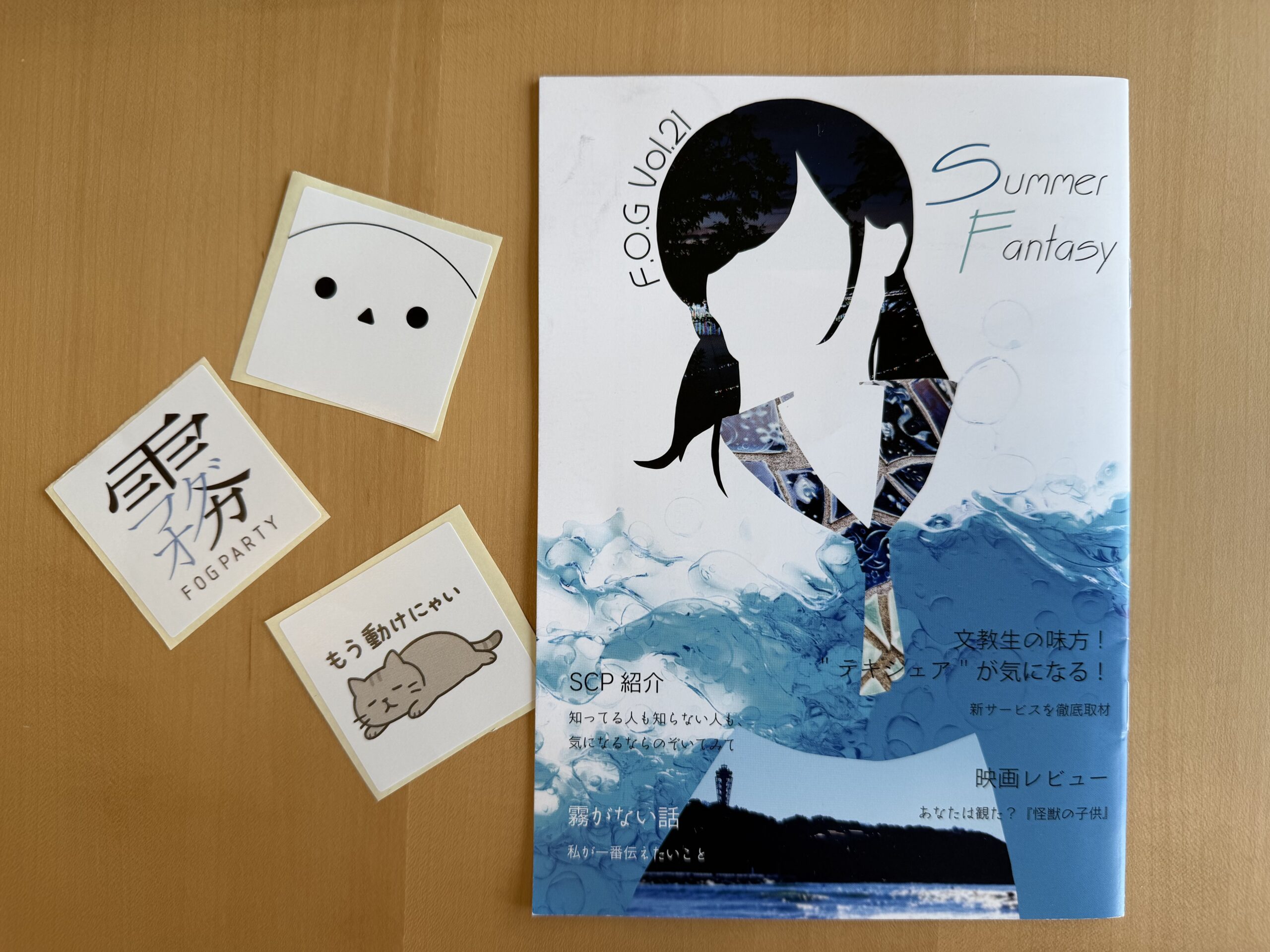 今回の聳塔祭の記念に作成したというステッカーももらいました。脱力系のねこちゃんやシマエナガがかわいくて癒されるステッカーと、FOG PARTYのXのアイコンにも使われているロゴのステッカーです。
