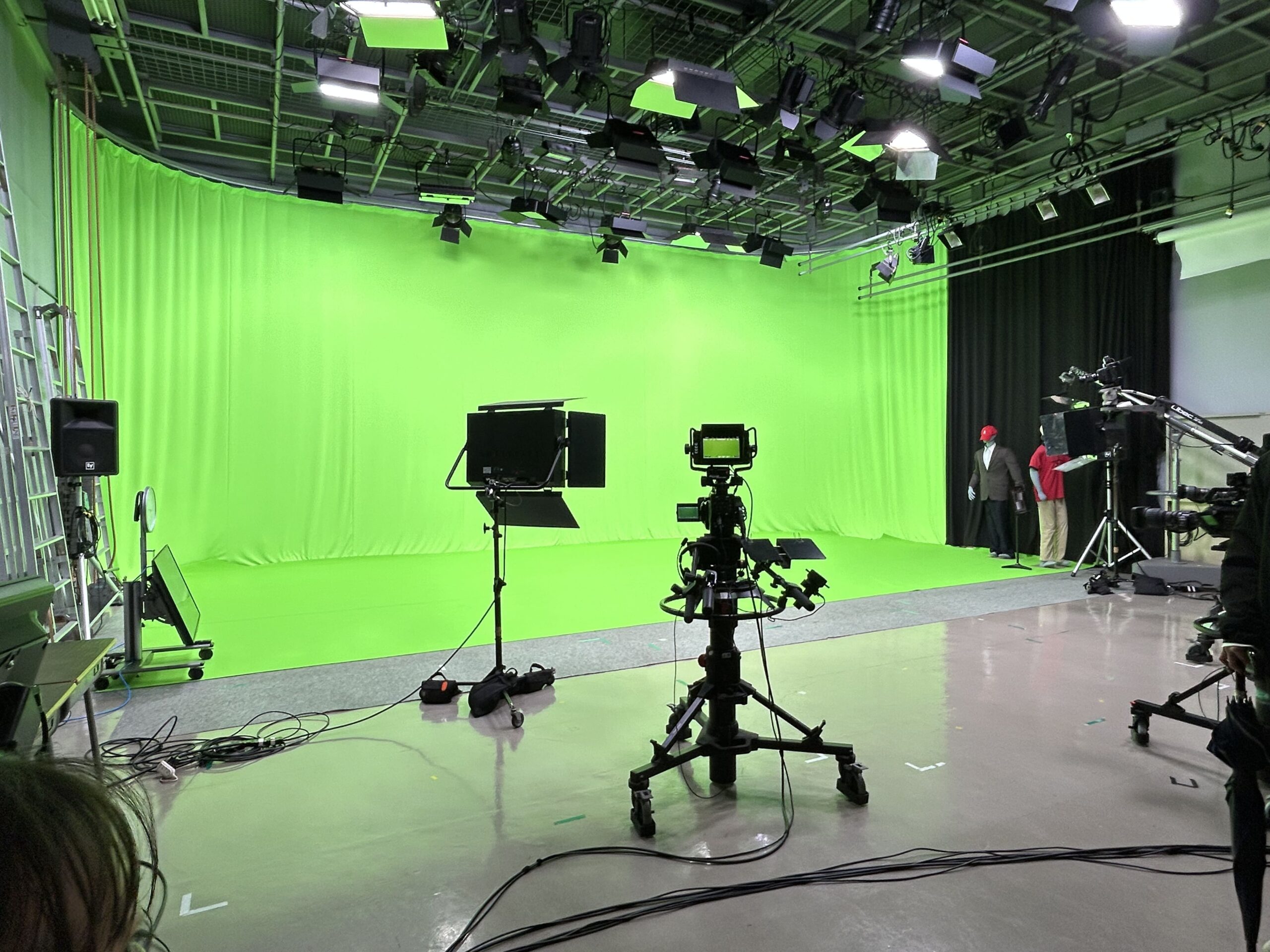 スタジオには映像を撮影するスタジオと、編集や調整を行う調整室があります。グリーンバックになっていて、リアルタイムでCGとの合成ができる本格的な仕様になっています。また、テレビ番組制作のためのカメラや照明、音響設備も揃っています。2025年夏にスタジオの機材が大幅にリニューアルされ、最新の4K高画質での撮影実習ができるようになりました。