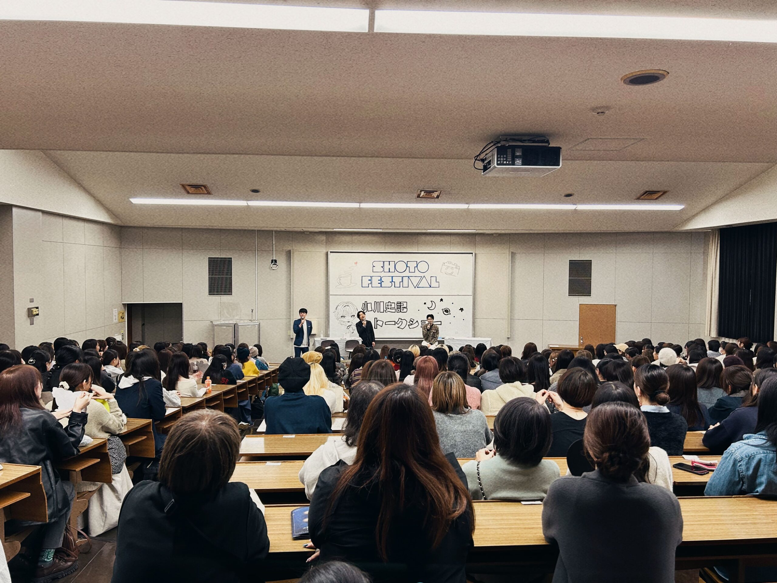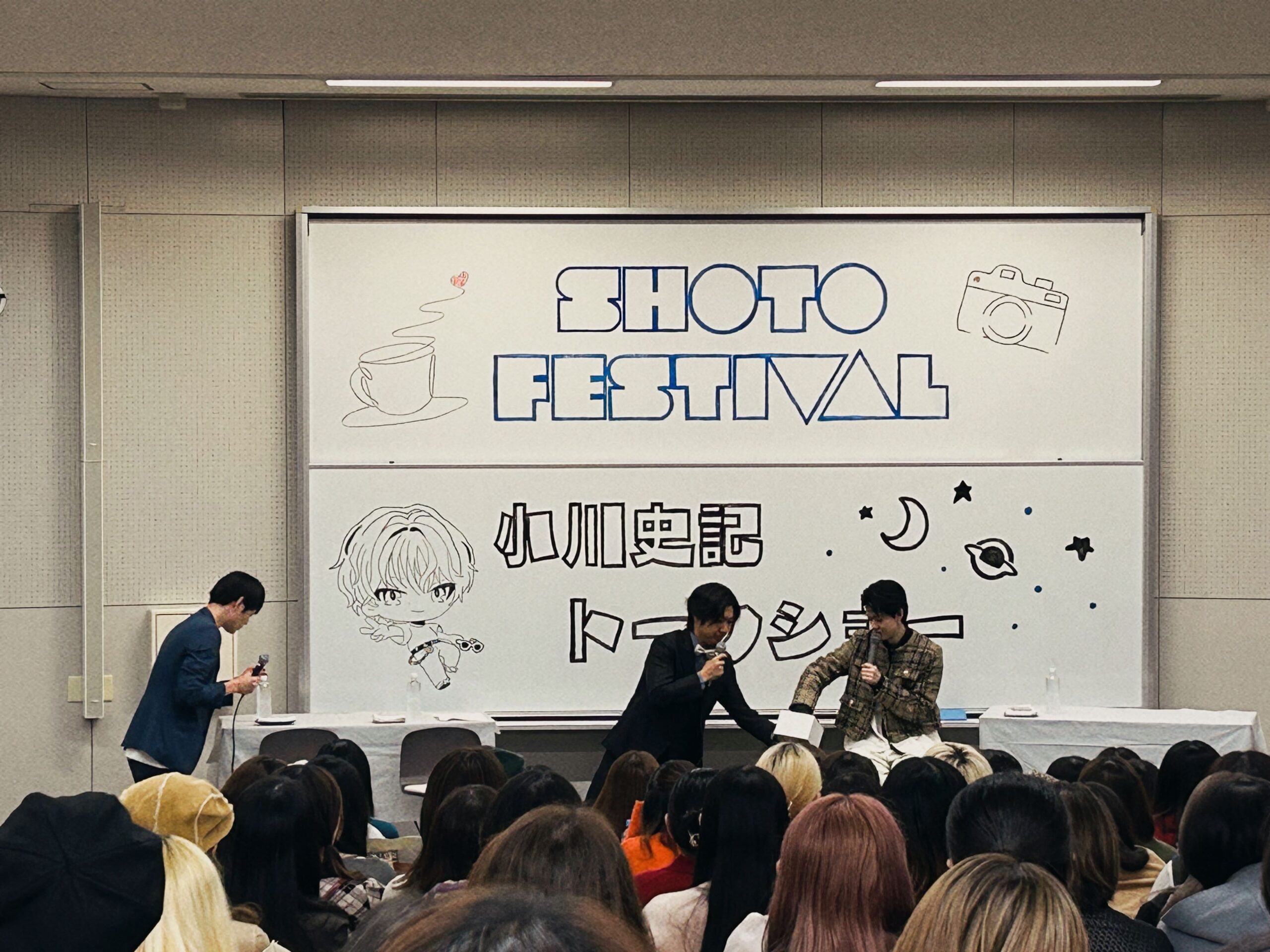 トークショーへの入場にはチケットが必要で、事前に学内生800円・一般1000円で販売されました。応援グッズの持ち込みも可能で、うちわや応援ボードで応援するファンの方も多くいました。あいにくの雨ではありましたが、会場は満席で、小川さんのトークショーの人気ぶりが伺えました。