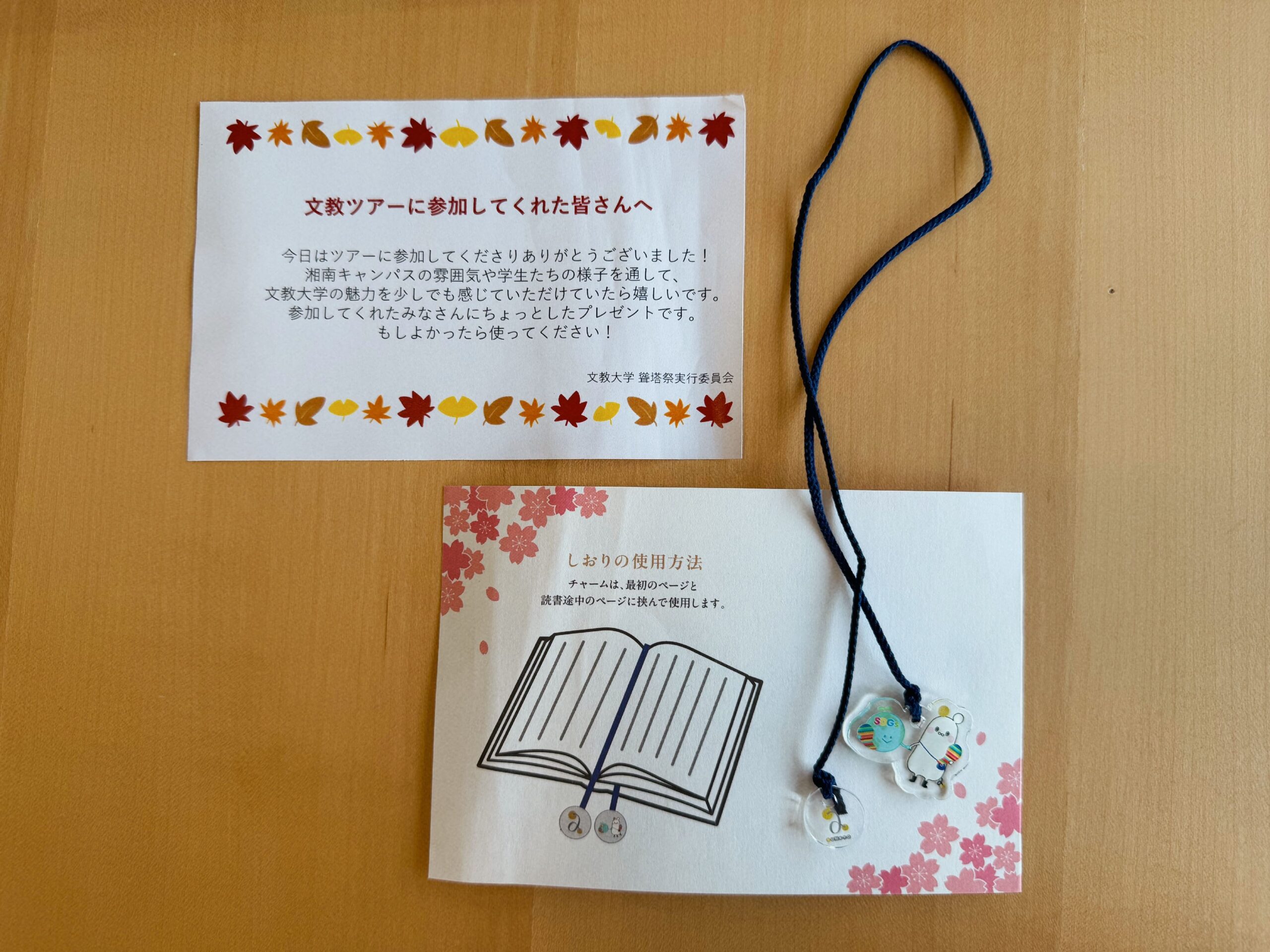 ツアーの最後に、おみやげのしおりをもらいました。文教大学のマスコットキャラクター「ぶんこちゃん」がかわいいですね。