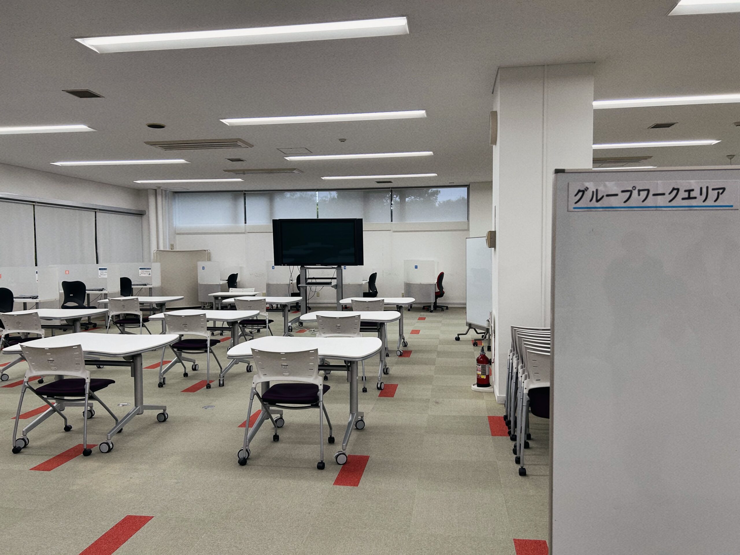 1階には「ラーニングスクエア」というエリアがあり、グループでの話し合いや、個人でのPC作業、プレゼンの練習など、いろんな学び方に合わせて利用できる空間になっています。授業の予習、復習から仲間とのディスカッションまで、自分に合ったスタイルで活用できるのが魅力です。とても明るく開放感があり、居心地も良さそうな図書館でした。