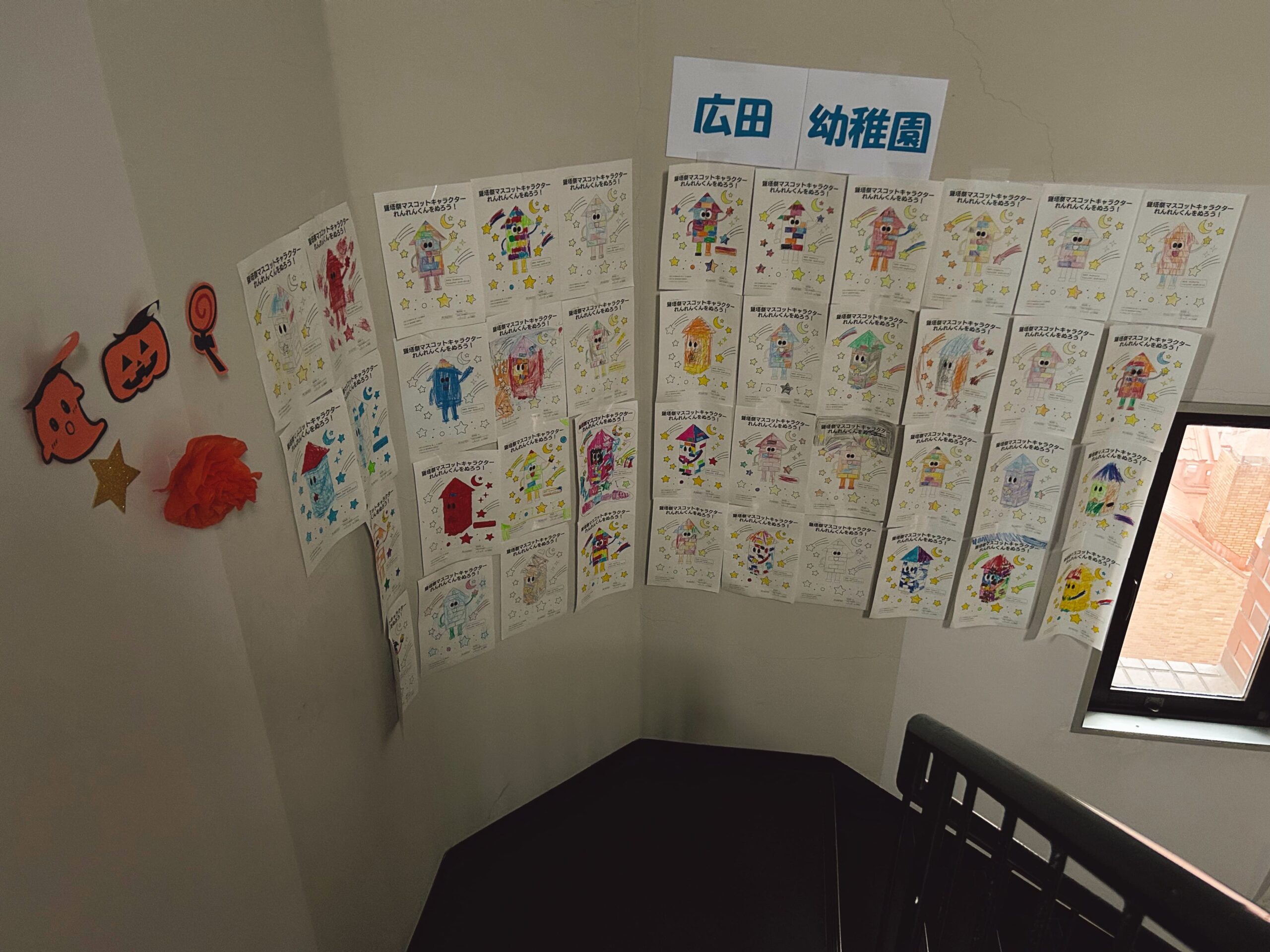 階段の途中には、聳塔祭のイベントのひとつ、塗り絵イベントの作品が飾ってあります。聳塔祭のマスコットキャラクター「れんれんくん」の塗り絵を、近隣の幼稚園・小学校の園児・児童が塗ったものだそうです。かわいらしい塗り絵に、階段を登ってきた疲れも和らぎました。