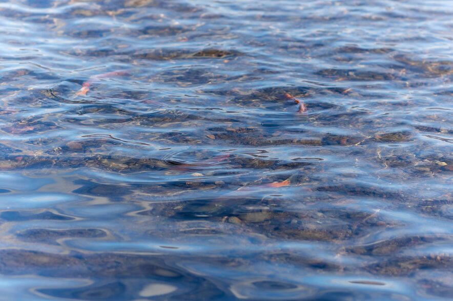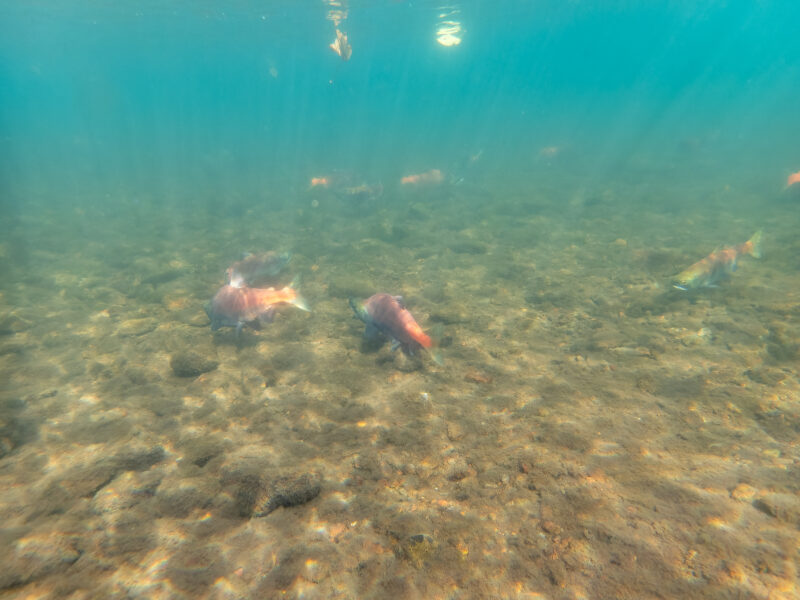 探すまでもなく、膝下くらいの水深にヒメマスがたくさん泳いでいるのがわかりました。赤く染った婚姻色で、水面からもその魚体がひと目でわかります。