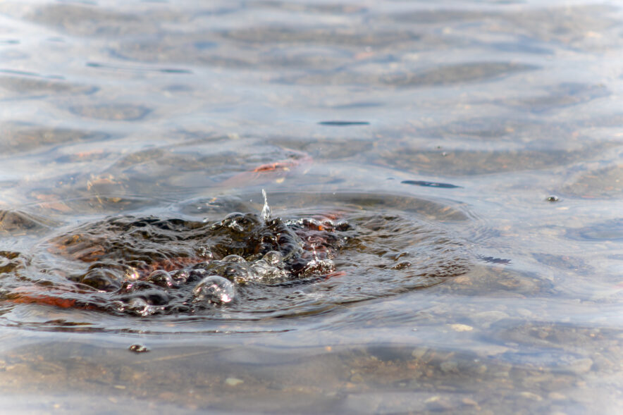 時々オス同士が争いあい、水面がバシャバシャと揺れます。ということは、この付近に彼らの産卵床があるのでしょう。