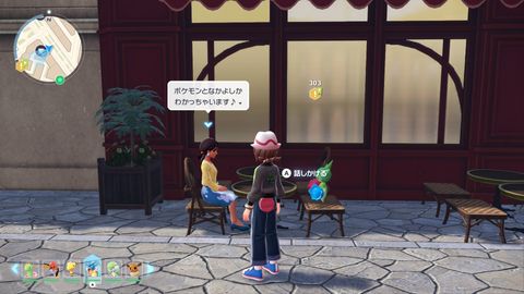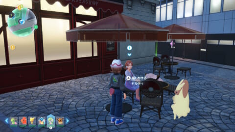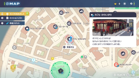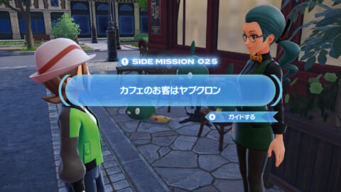 カフェ・かわいがりにいるフウミと会話後、ヤブクロンを引き連れて、道なりに進んだ先にあるゴミ箱までいくとミッションクリアとなります。