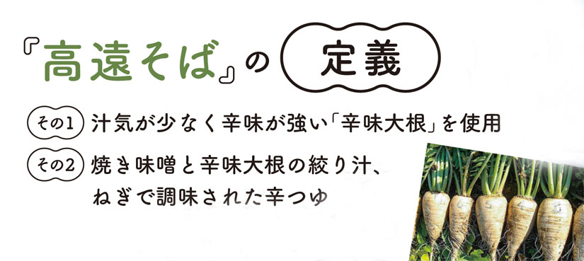 伊那市高遠の山間部の家庭で昔から作られていた「辛つゆ」。これは、節類とダシを使った一般的なつゆの代わりに、辛味大根のおろし汁に焼いた味噌を溶かし、さらにネギの辛みを加えたもので、この辛いつゆで食べるのが「高遠そば」。