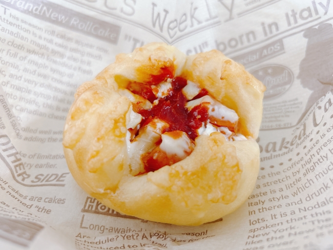 まずはこちら、ランチにぴったりな『スパイシーウインナー』(172円)。ふんわりとしたパン生地の中には、ピリッと辛いウインナーと、とろーりモッツァレラチーズが隠れています。ケチャップの酸味も加わり、食欲をそそる組み合わせです。