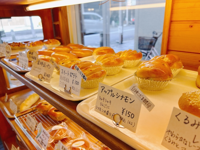 棚に並ぶパンは、そのほとんどが100円台とお手頃価格。国産米粉や白神こだま酵母、自家農園の野菜を使うなど、小さな子どもにも食べさせやすいパン作りをされているのが嬉しいポイントです。