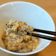 牛乳を3〜4回に分けて少しずつ加え、その都度よく混ぜます。かたまりをほぐすように混ぜ、なめらかなペースト状にします。