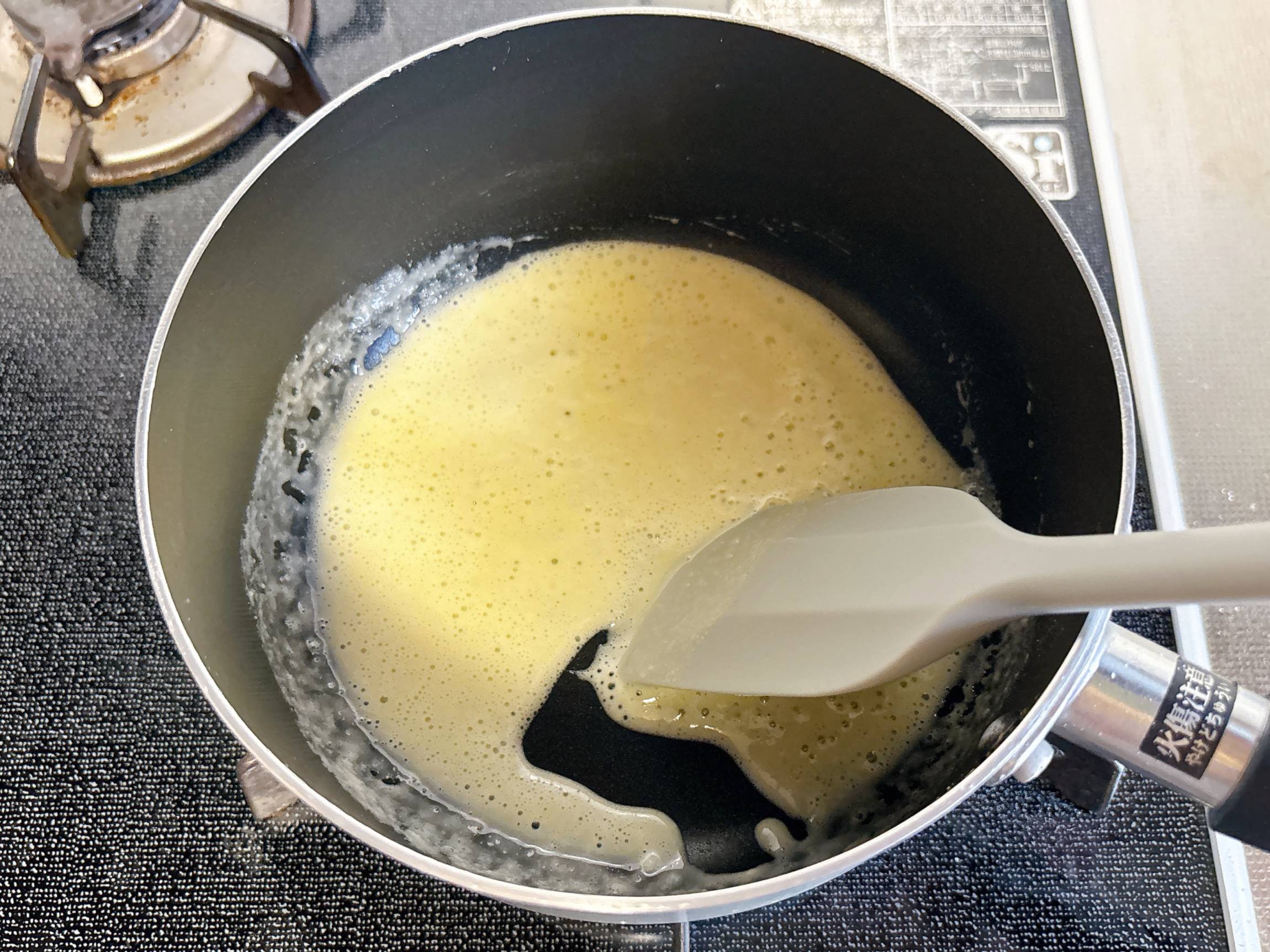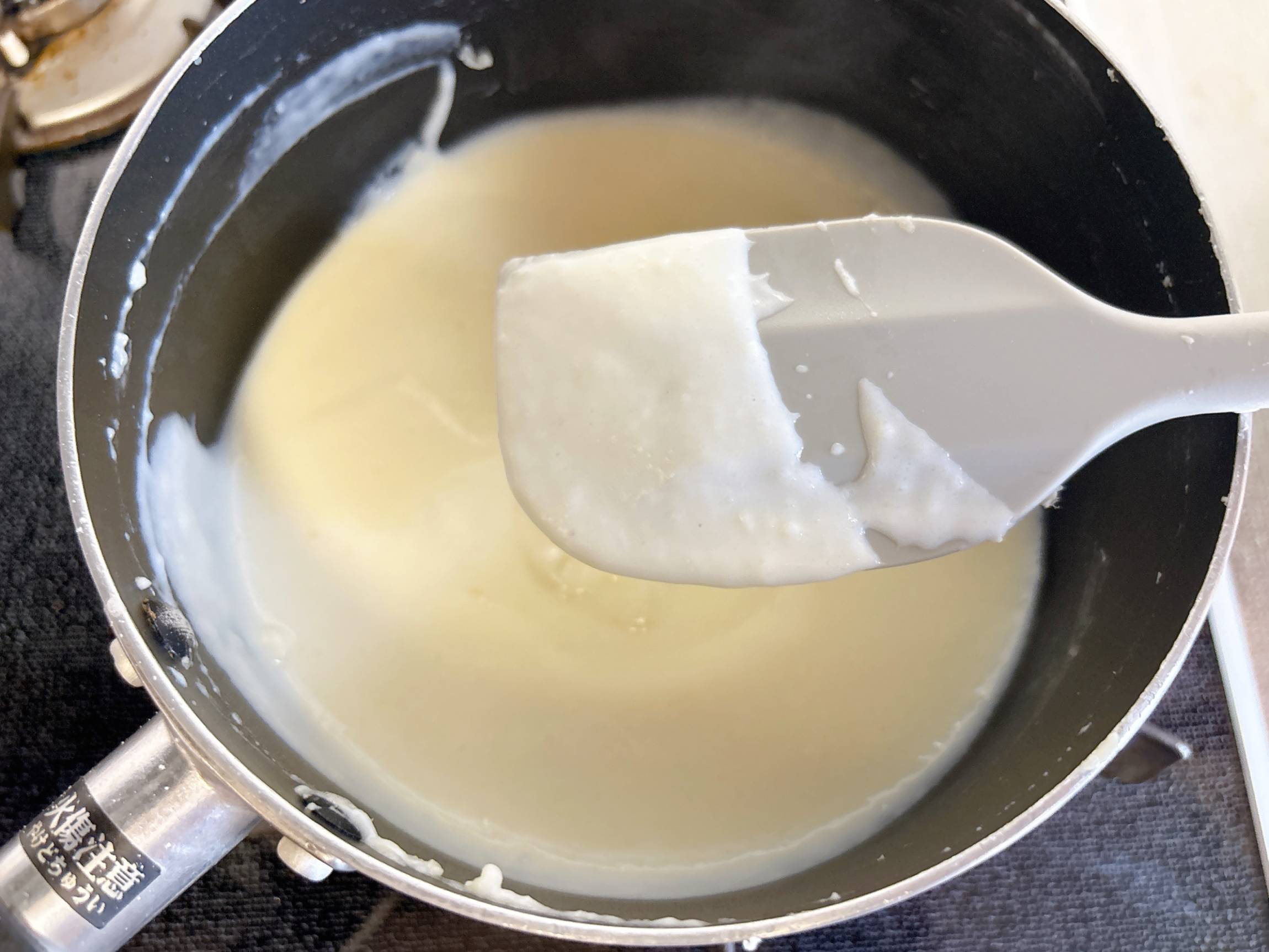 軽くとろみがつくまで煮込みます。ゴムベラですくうと、すっと流れ落ちていきます。ダマのないきれいなホワイトソースができあがります。