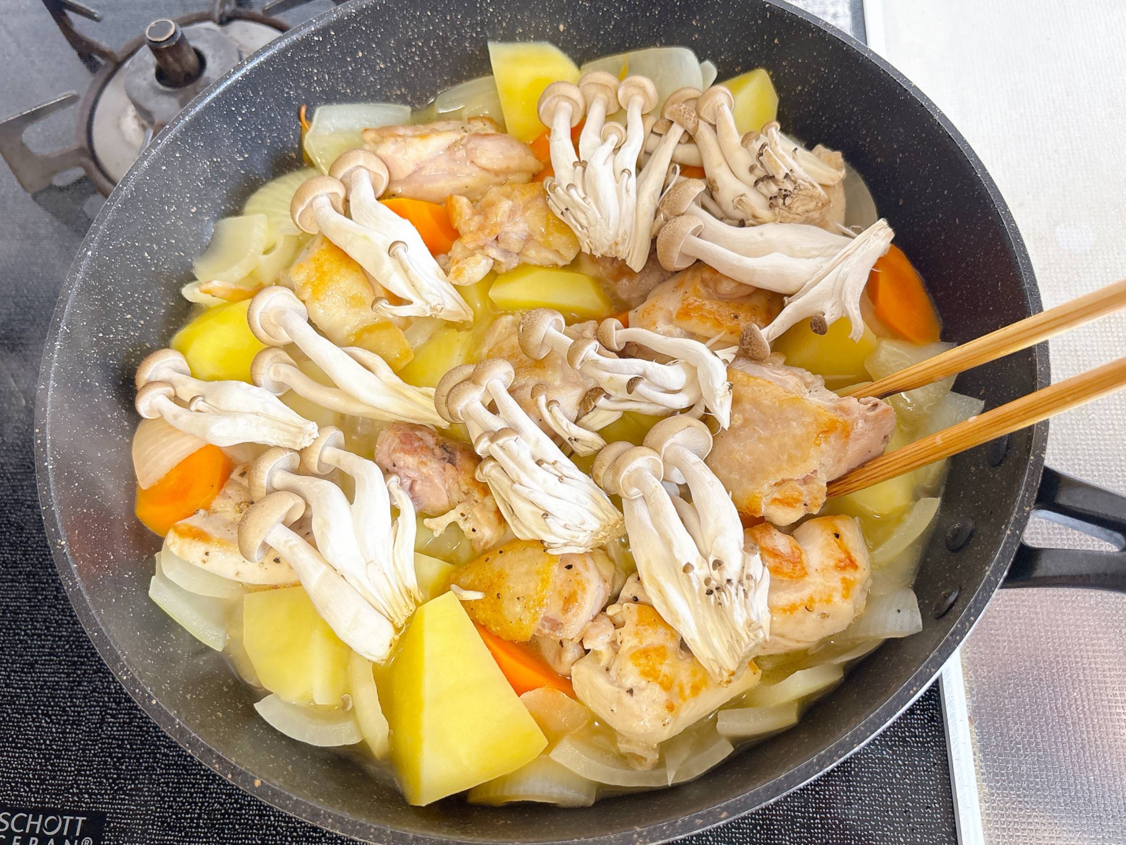 取り出しておいた鶏もも肉としめじを加えて蓋をし、具材がやわらかくなるまで中弱火で15〜20分ほど煮ます。