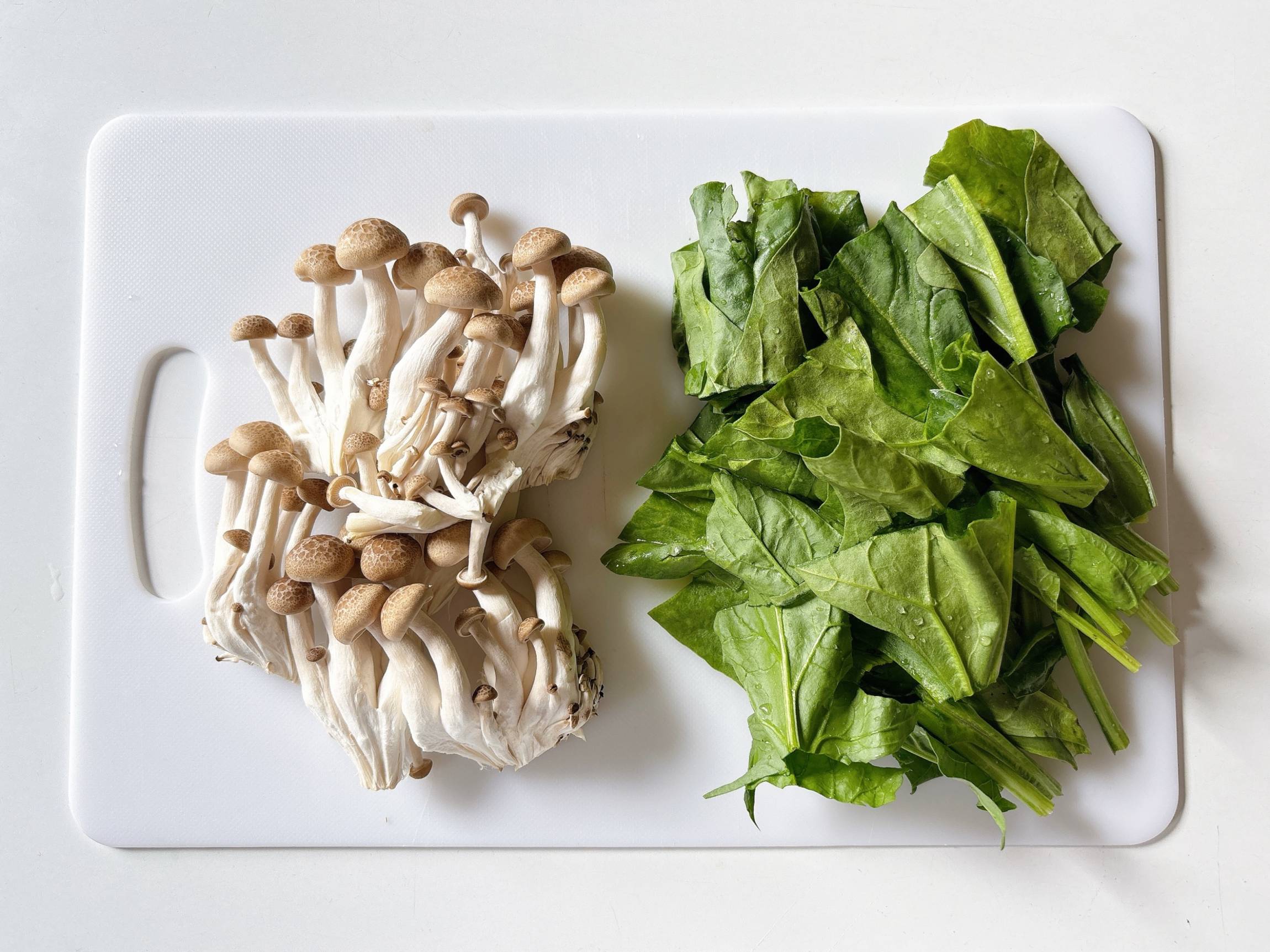 しめじは石づきを取り、大きめに割きます。 ほうれん草は水洗いしてから、5cm幅程度の大きさにざく切りします。