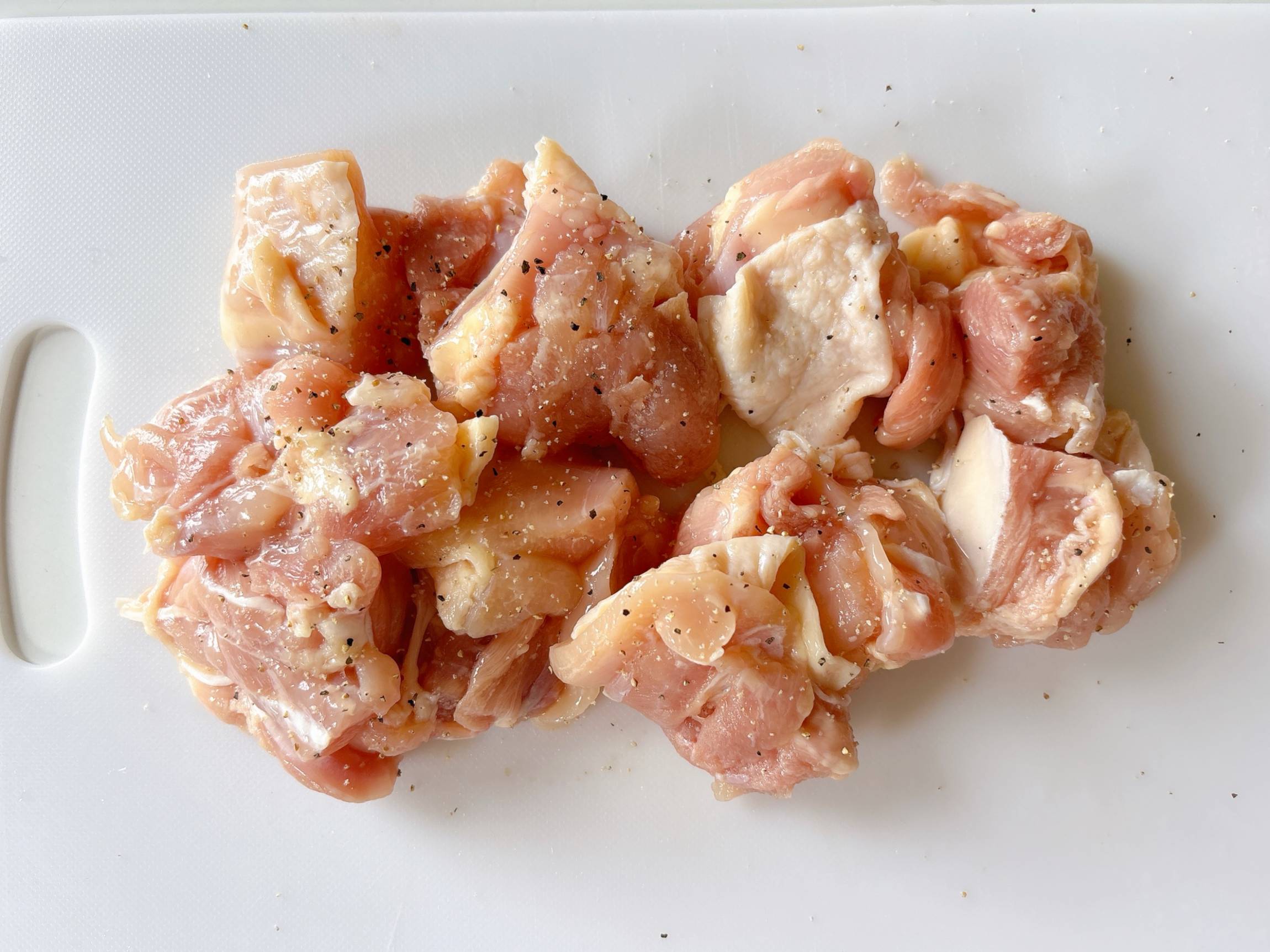 鶏もも肉はひと口大に切り、塩こしょう(分量外)しておきます。