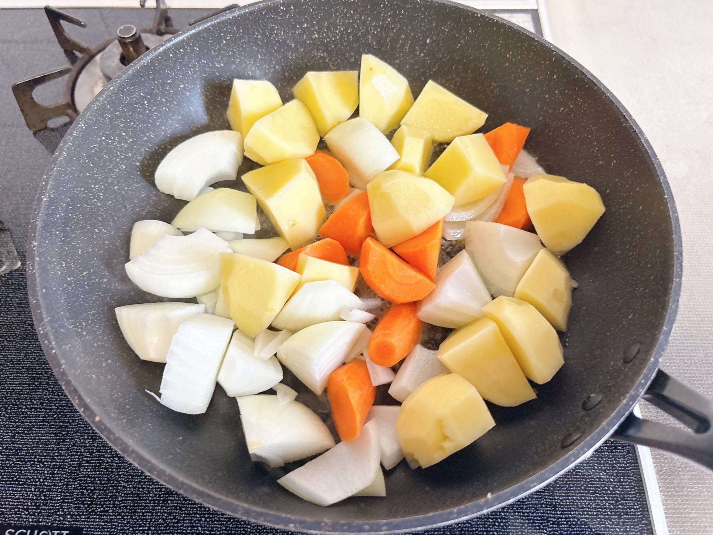 フライパンに残った油をキッチンペーパーで拭き取り、バターを加え、玉ねぎとじゃがいも、にんじんを炒めます。