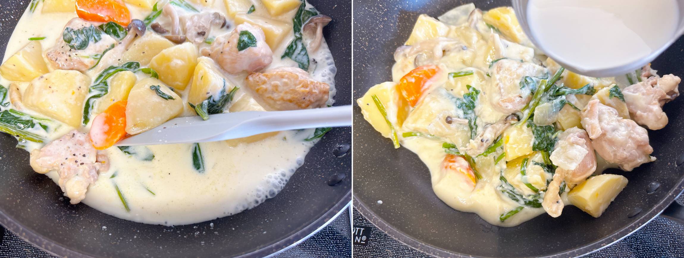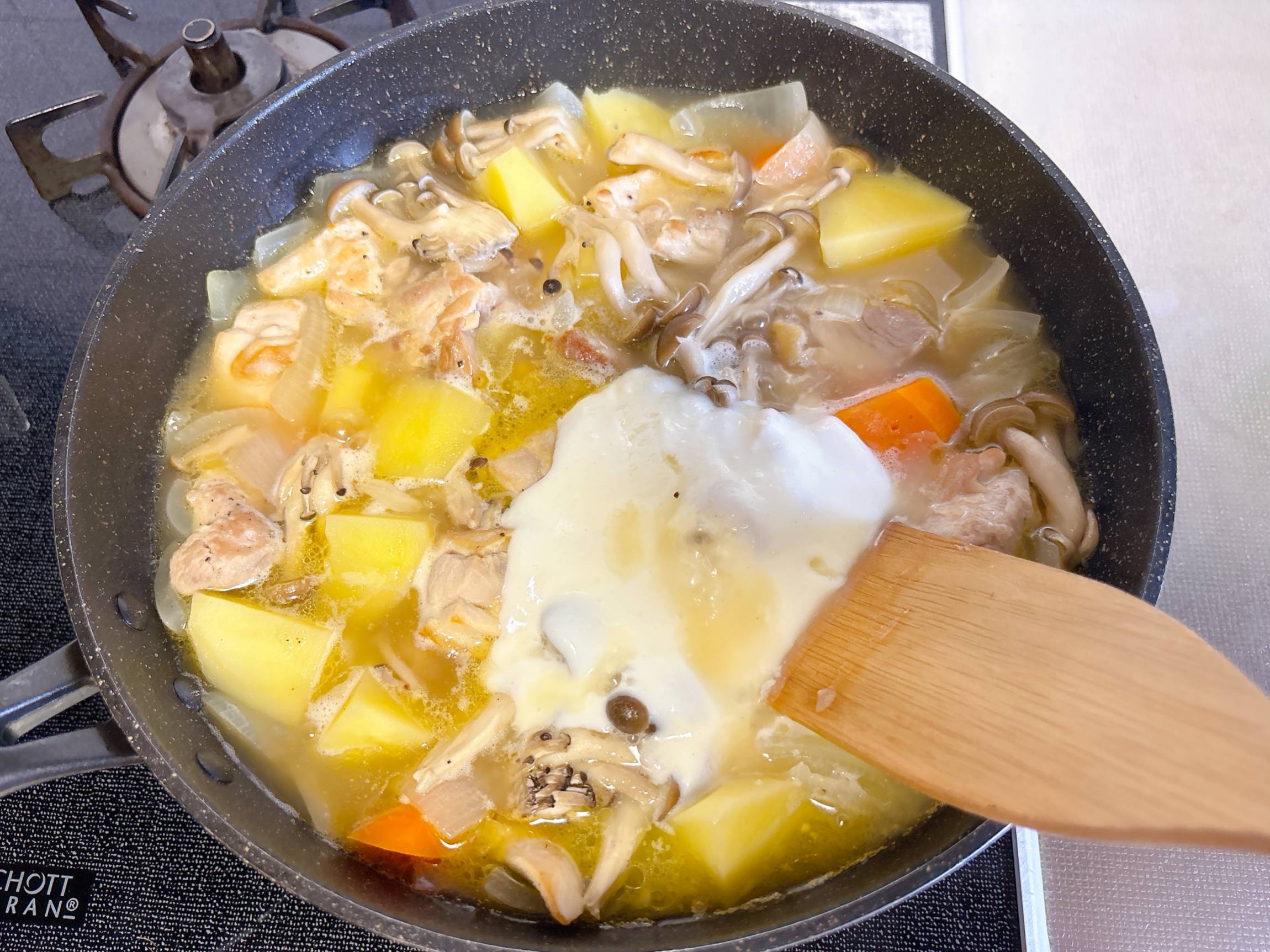 ※そのままシチューを作るのでフライパンは大きめのものを使用してください。