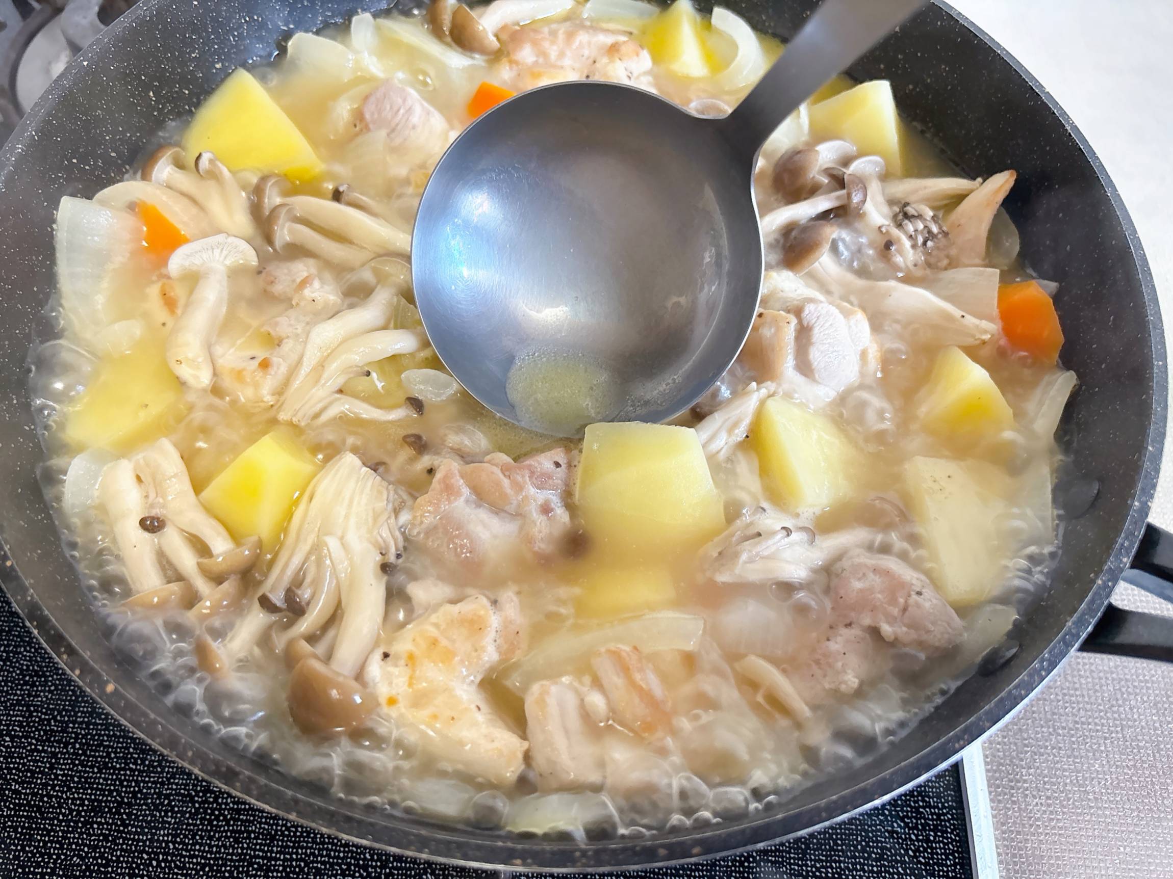 シチューがサラサラすぎてとろみが足りない場合は、加熱時間を追加し煮詰めてください。
