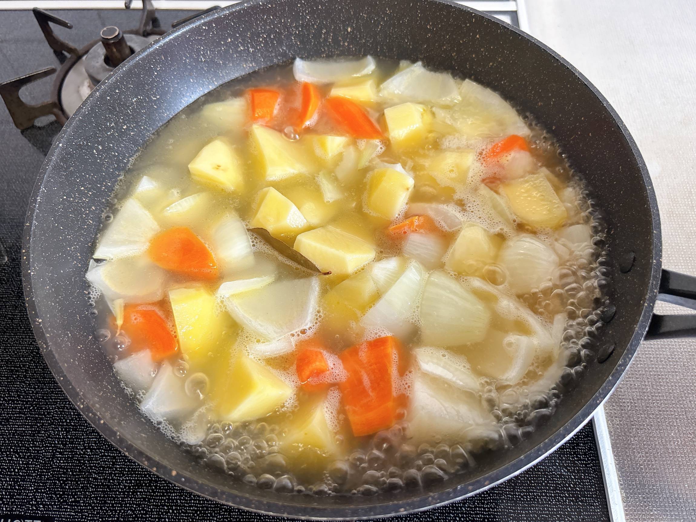 全体に油が回ったら、水と固形コンソメ、ローリエを加え5分ほど煮ます。