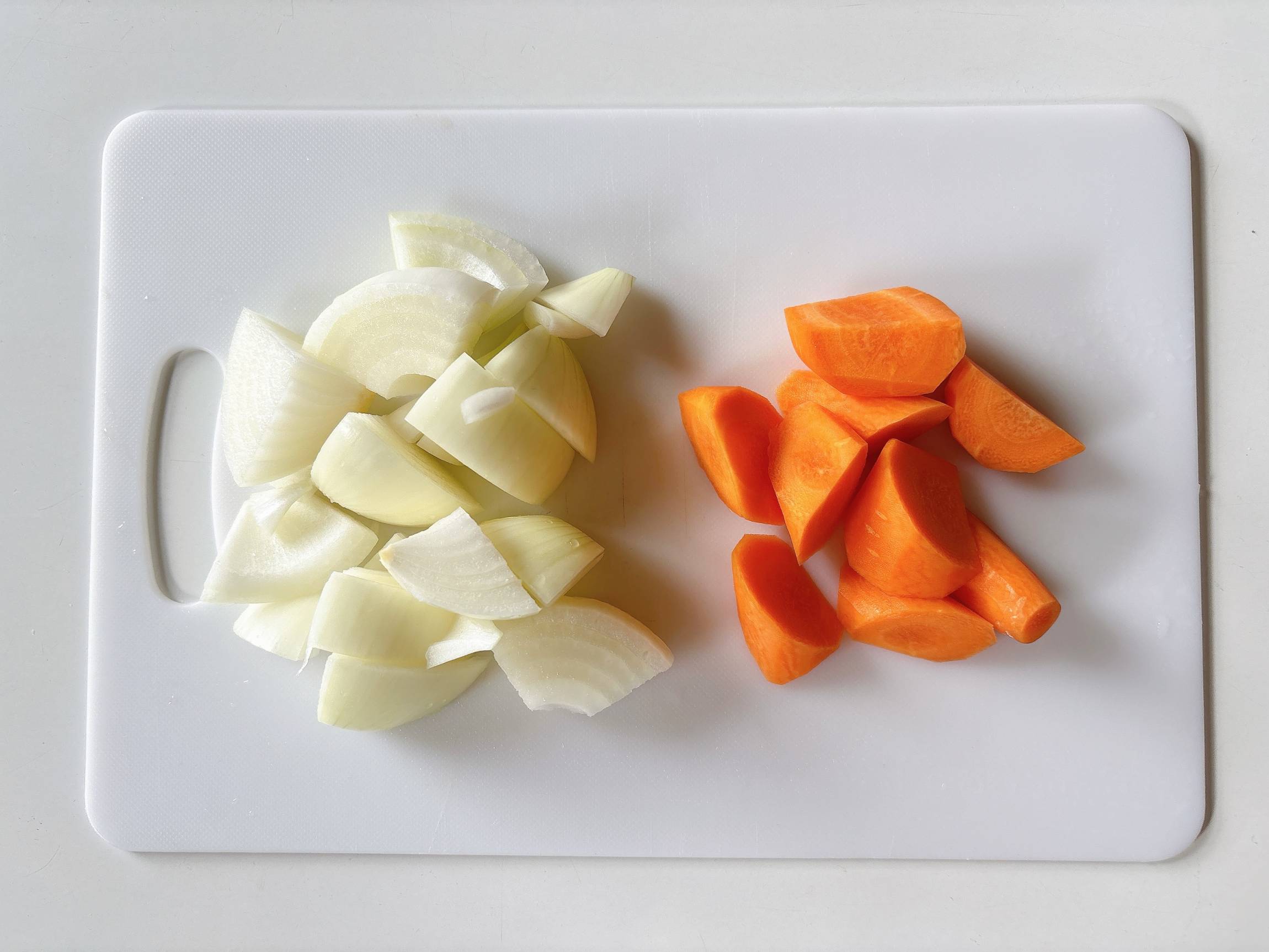 玉ねぎはひと口大に切りにんじんは小さめの乱切りにします。