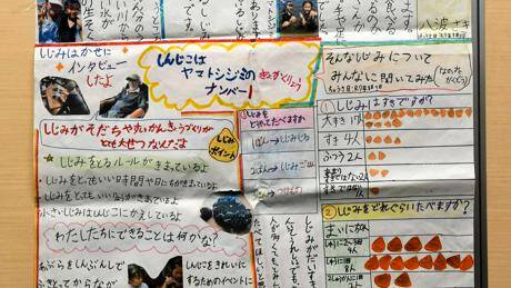 子供たちは手のひらサイズのキジハタを観察し、そのあとは元気な声で「大きくなってね」と海に放した。