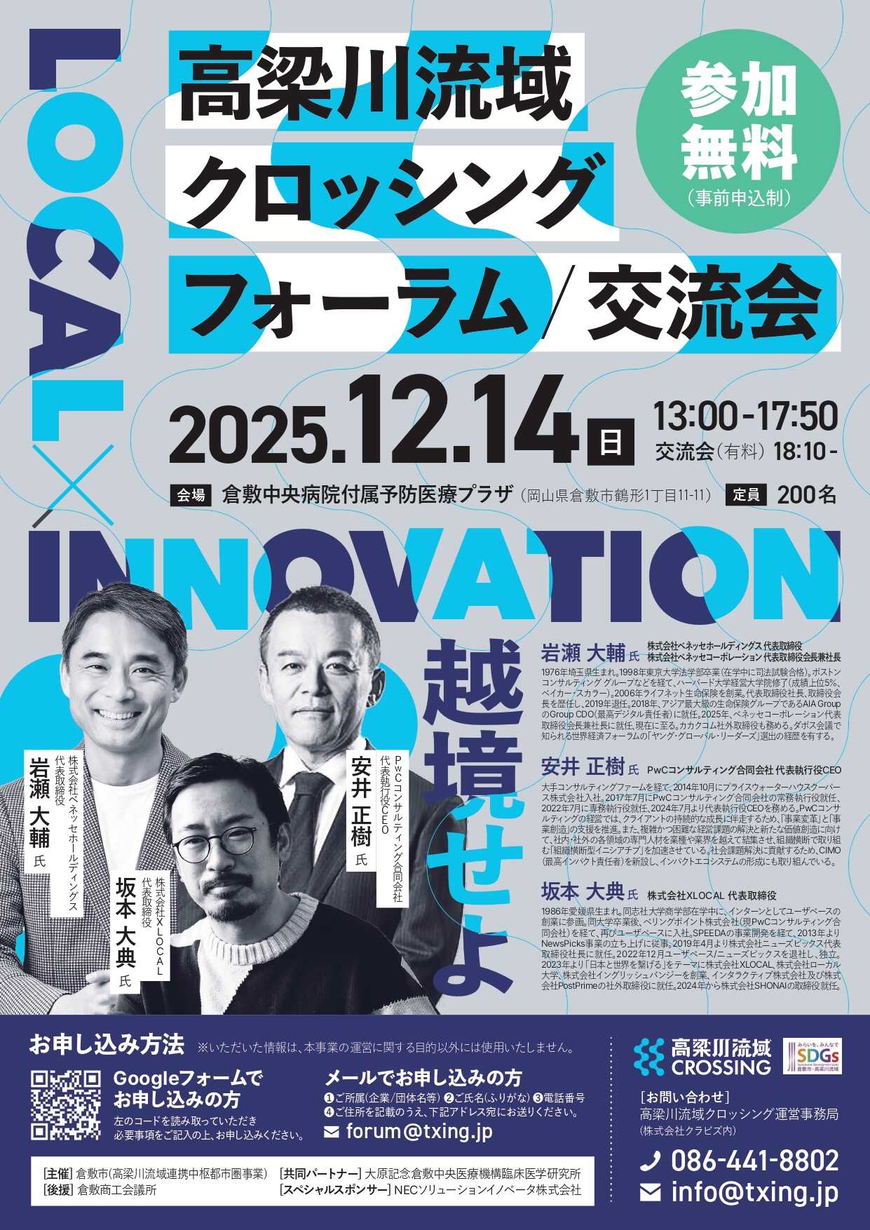 高梁川流域クロッシングフォーラム/交流会は、2025年12月14日(日)に倉敷中央病院付属 予防医療プラザで開催されるイベントです。