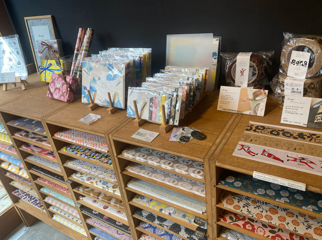 大判の包装紙が並べられている一方、反対の壁にはレガーロ パピロオリジナルのデザインを使用したクラフトテープや封筒などの紙雑貨のほかに、小さめのラッピングペーパーが陳列されていました。