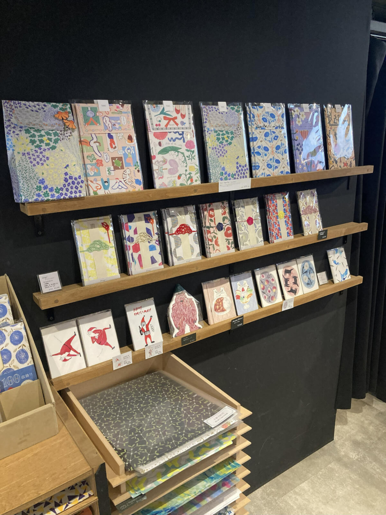 細かく仕切られた棚に、花や動物などの個性的な柄がプリントされたラッピングペーパーがお行儀よく並べられている様子は、見ていて思わず笑みがこぼれます。