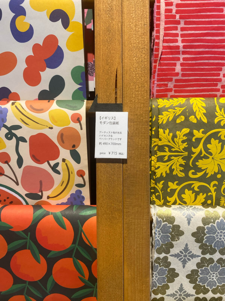 こちら(写真左側)はイギリスのモダン包装紙(約490mm×700mm)。1枚715円(税込)です。