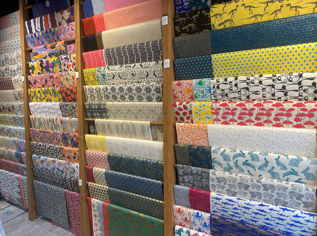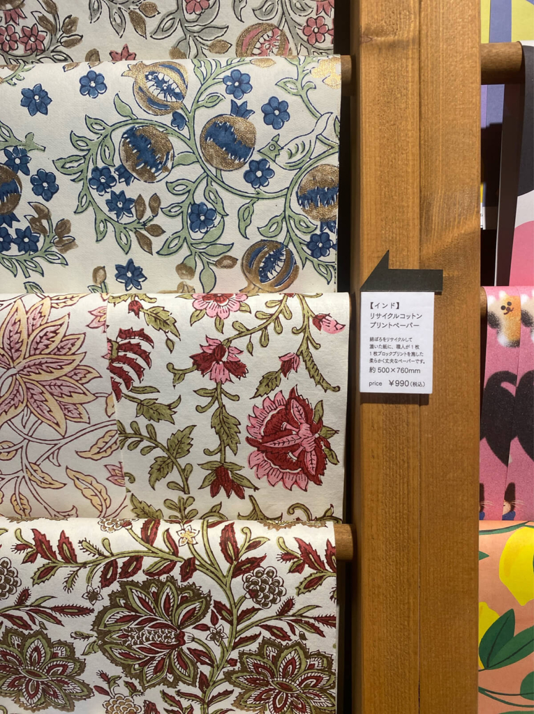入店してまず圧巻されたのは、壁にかけられた総柄のたくさんの包装紙たち。