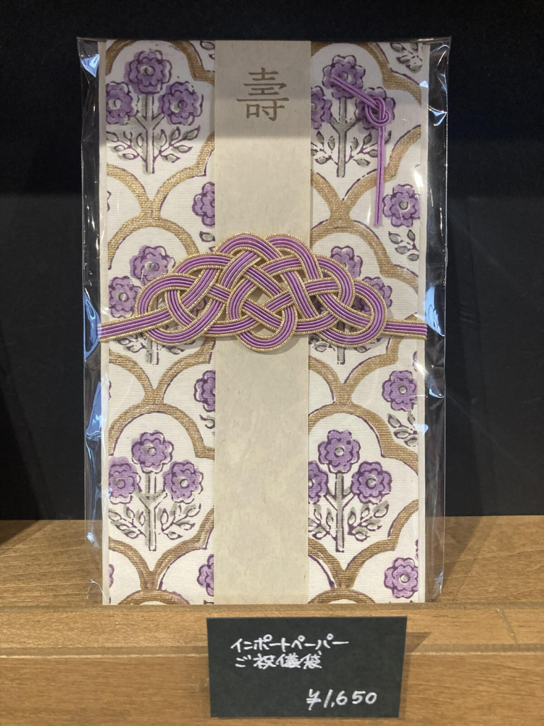 インドのインポートペーパーで作られた上品なデザインのご祝儀袋(1650円)は、少々お値段は張りますが、結婚式に華やかさを添えること間違いなしです。