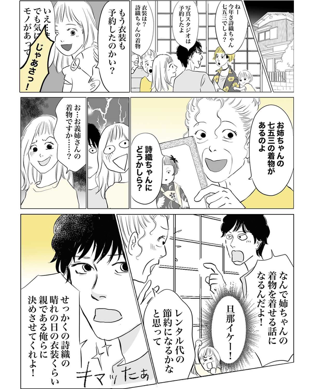 もうすぐ詩織(仮名)ちゃんの七五三。義実家でも話題に上がり、話は詩織ちゃんに着せる着物の内容に……。すると義母が信じられないことを言い出したのです。
